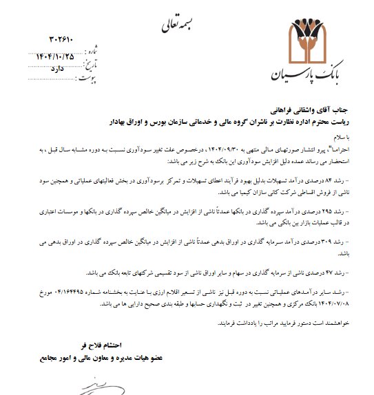 بانک پارسیان توضیحاتی در خصوص اطلاعات و صورت های مالی منتشر شده با توجه به علت تغییر سود ۸۴ درصدی درآمد و تسهیلات ارائه کرد.