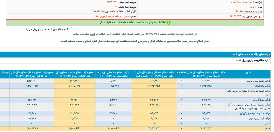 شرکت تامین سرمایه خلیج فارس در یک ماه منتهی به آذر ماه مبلغ ۱۱۵۸ میلیارد درآمد محقق کرد.