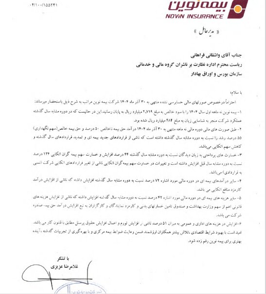 ۱- بیمه نوین نه ماهه اول سال ۱۴۰۴ را با سود خالص به مبلغ ۲۷۱۹ میلیارد ریال به پایان رسانید . این در حالی است که در دوره مشابه سال گذشته عملکرد شرکت منجر به شناسایی زیان به مبلغ ۴۸۴ میلیارد ریال شده بود.